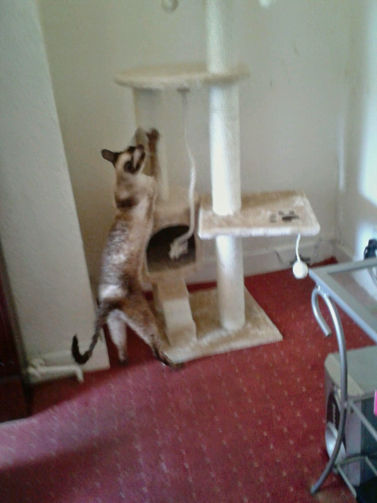 before we adopted Coco whenever we were walking up the road to the shops Coco would always follow us and either Anne or myself would have to wait at the top of the road so he wouldn't follow us to the main road, he would always wait until we were all together again and walk back with us chatting away and jumping up on the wall to give us head rubs. When we got home he would just walk in the house and go upstairs for something to eat and then sleep it off, he was hard faced and cheeky and knew what he wanted and invariably got it, it was his cheeky side which made Sheba like him so much he would never back down to her and was definitely the boss.